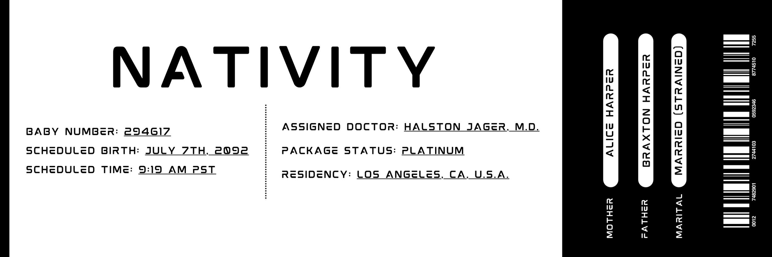 LOGLINE: A young married couple in 2092 have a meeting with their doctor at the Nativity program for genetically constructing their first child, but as more choices are asked of them, they realize some rather fundamental questions still need to be discussed.